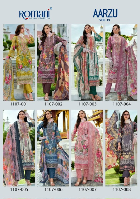 ROMANI AARZU VOL 19 contains superior Fabrics, with perfect craftsmanship makes it one most best quality suits catalogue. Best commitment to ungearing quality.
