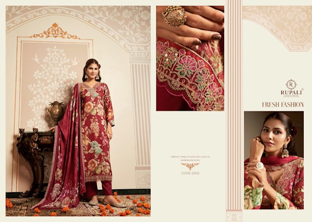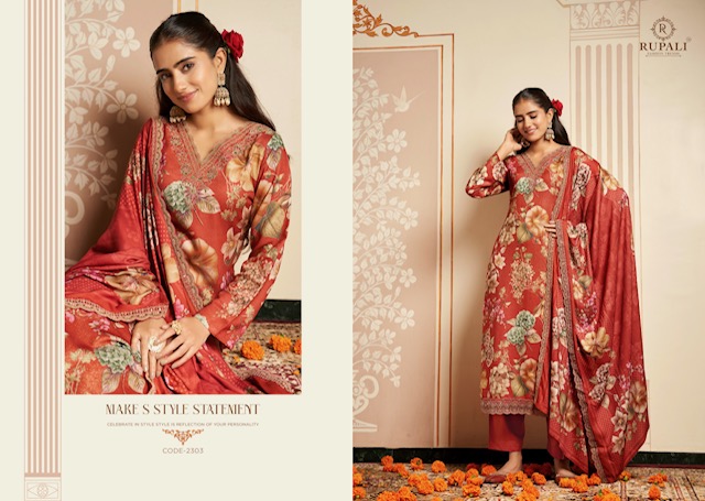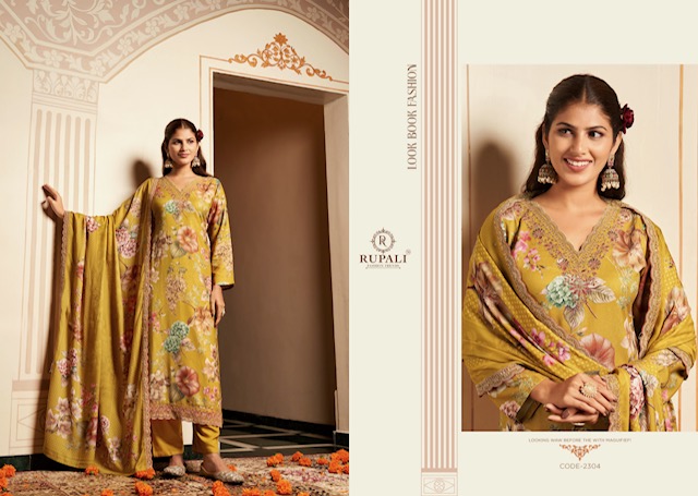 RUPALI FASHION BHAVYA contains superior Fabrics, with perfect craftsmanship makes it one most best quality suits catalogue. Best commitment to ungearing quality.
