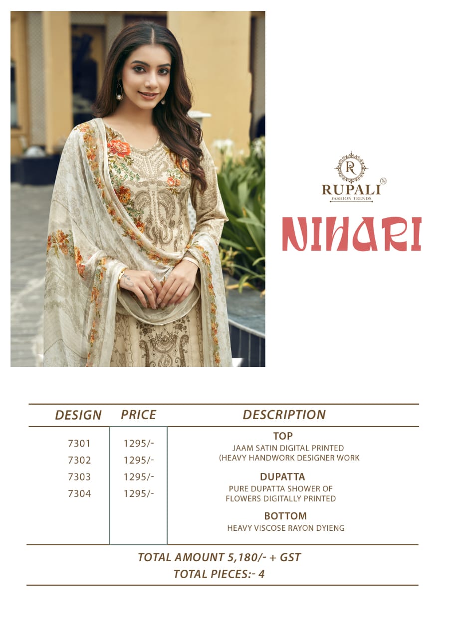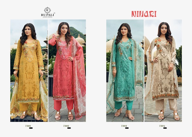 RUPALI FASHION NIHARI contains superior Fabrics, with perfect craftsmanship makes it one most best quality suits catalogue. Best commitment to ungearing quality.