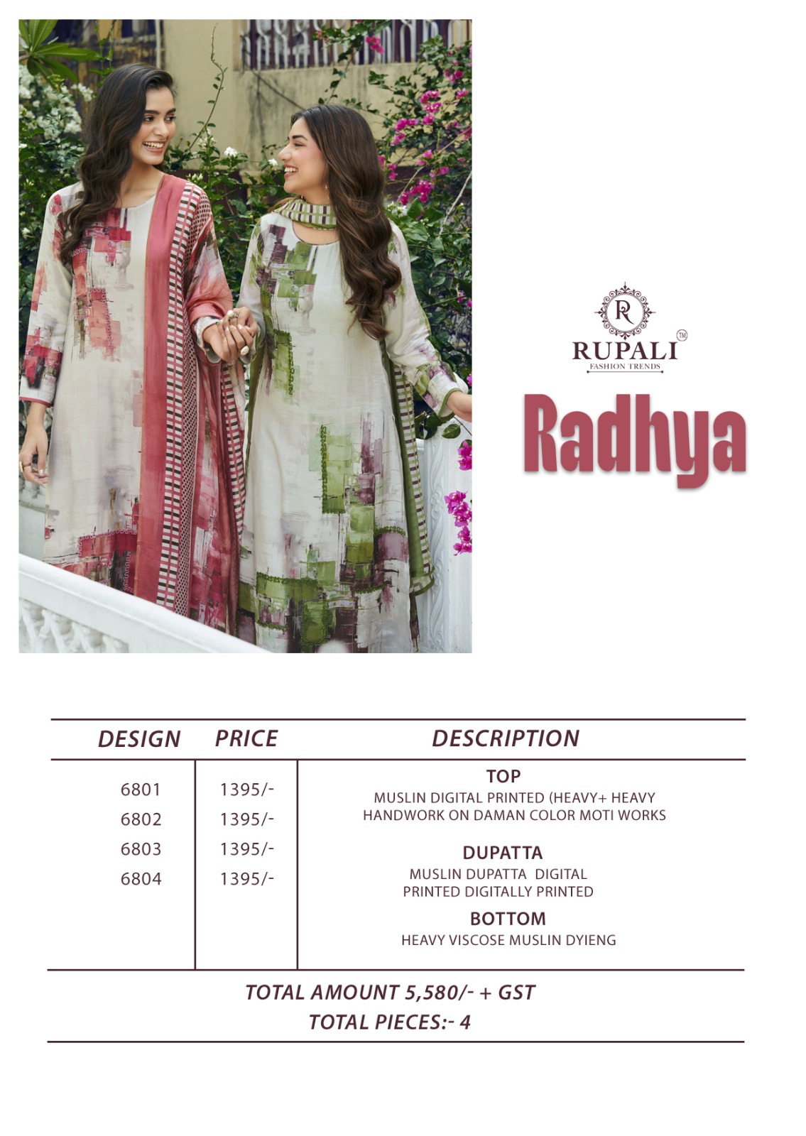 RUPALI FASHION RADHYA contains superior Fabrics, with perfect craftsmanship makes it one most best quality suits catalogue. Best commitment to ungearing quality.