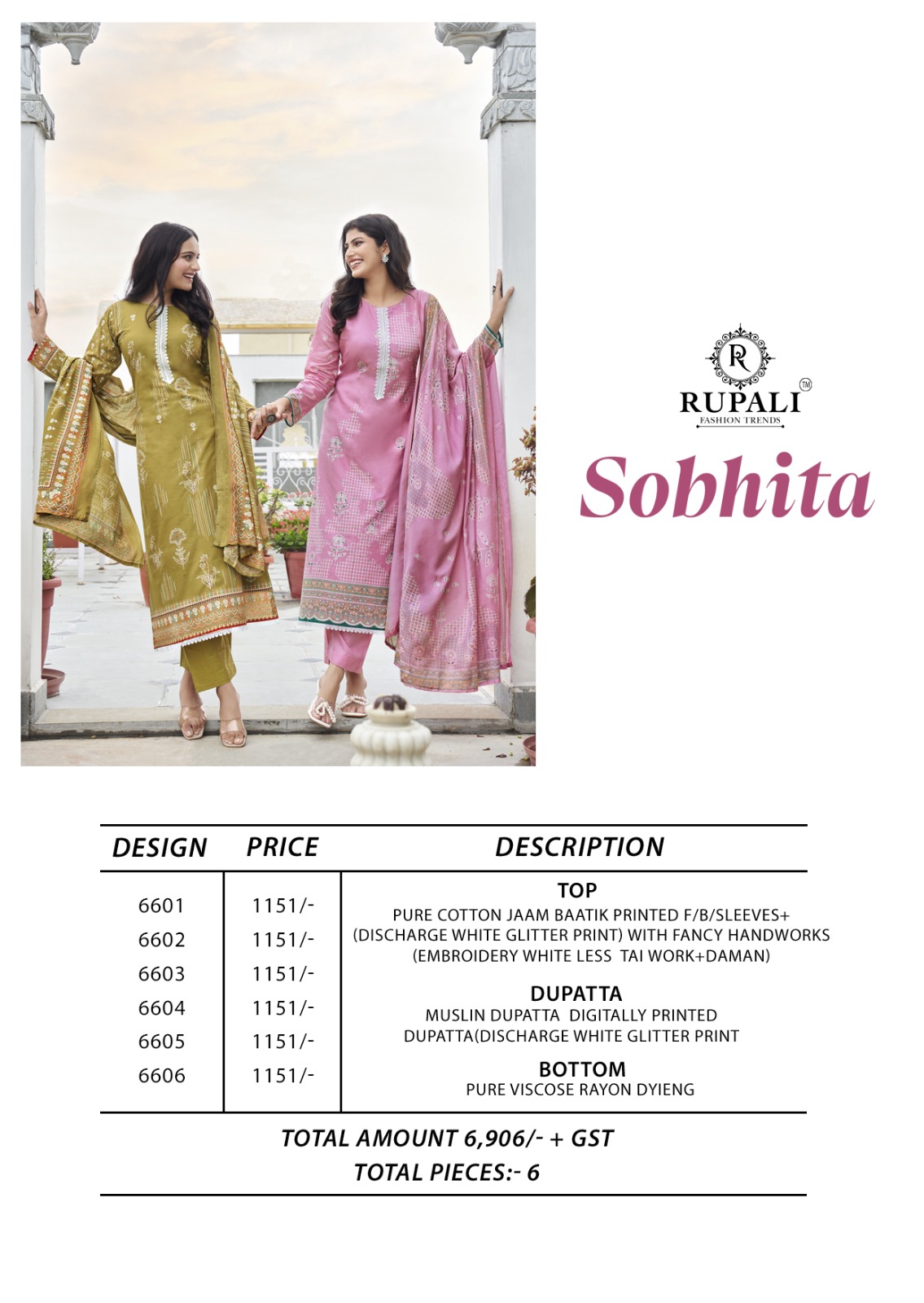 RUPALI FASHION SOBHITA contains superior Fabrics, with perfect craftsmanship makes it one most best quality suits catalogue. Best commitment to ungearing quality.