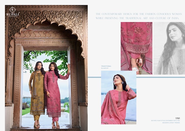 This catalogue contains design which contains both traditional beauty and modern twist. That celebrating India’s rich textile heritage. It Brings awareness and response to current events and cultural trends. Whether you are going for a party, a wedding, or simply it makes your wardrobe traditional, the RUPALI PRERNA collection promises to add shade of beauty to your look. With vibrant prints, luxurious fabrics, and beautiful designs, each suit tells a story of style. Having or showing a lot of experience and knowledge about the world and about culture, art, literature, etc.