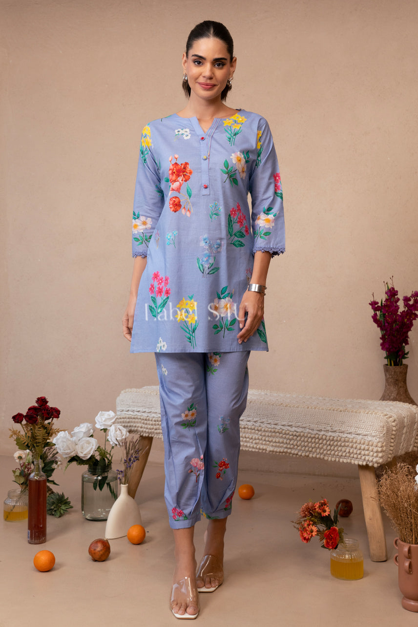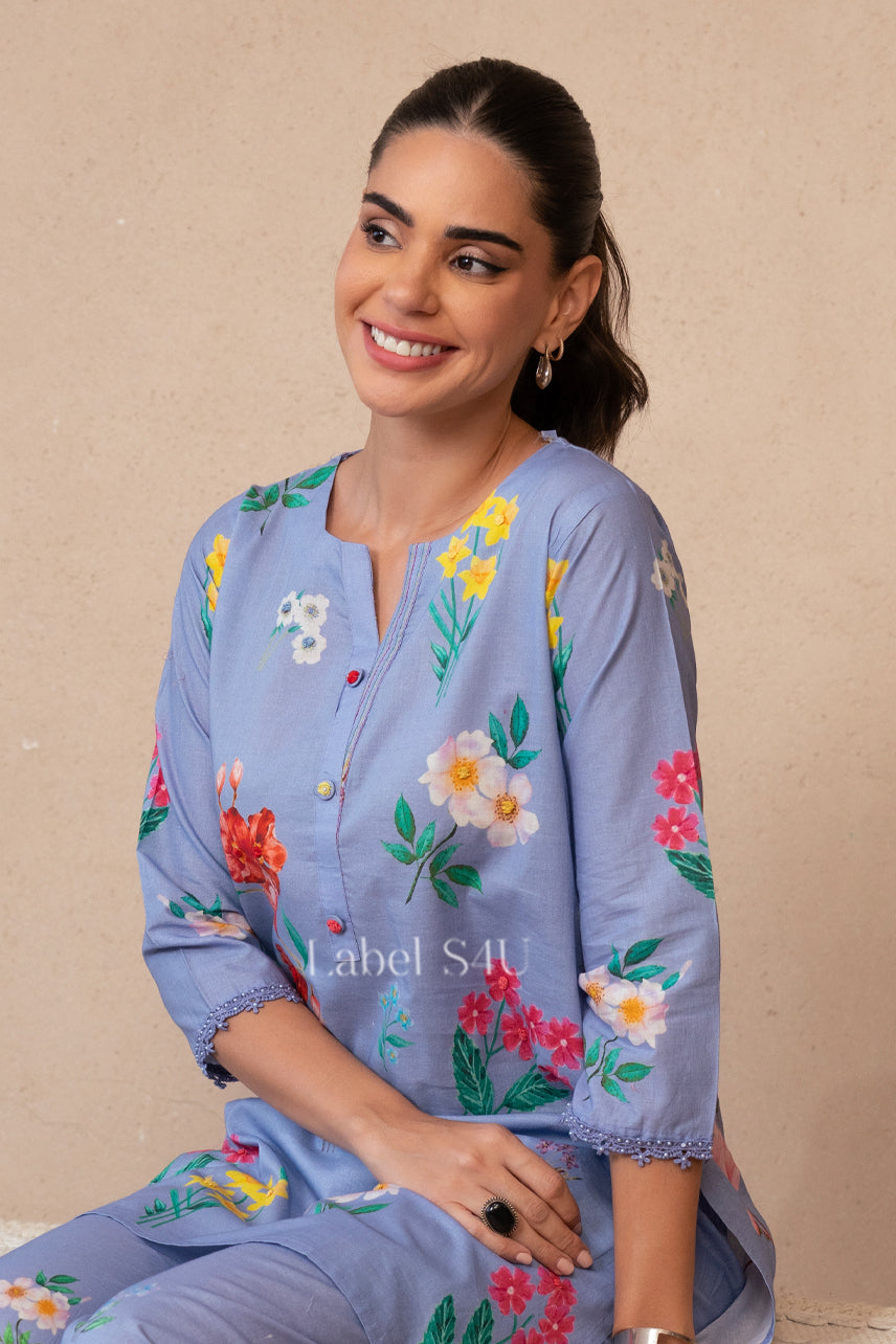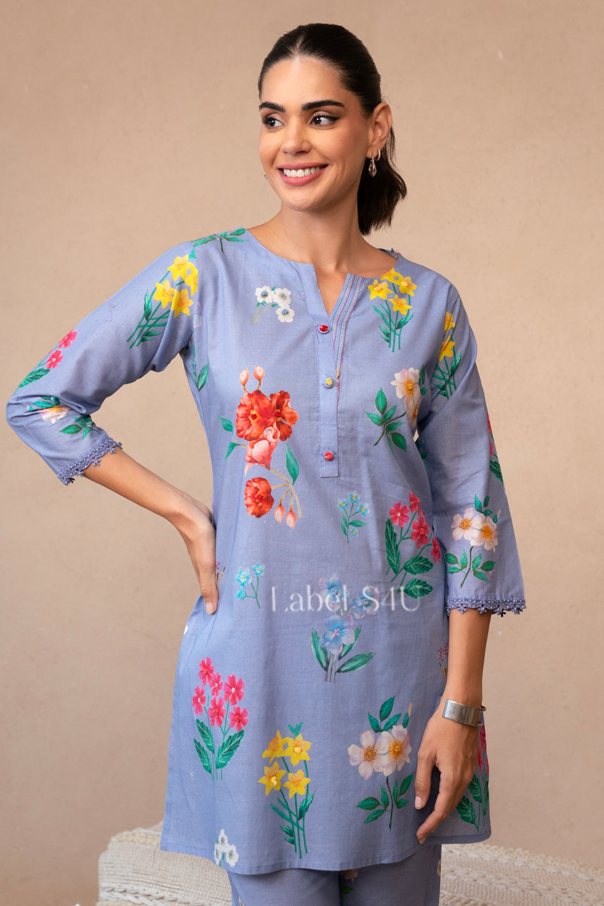 Chic meets cheerful in our Bloomscape Co-Ord. Featuring vibrant floral prints over a pastel lavender base, this straight kurta and pant set is tailored for comfort and charm. Light, breathable, and versatile — it’s your all-day companion for everything from casual catch-ups to cozy home gatherings.