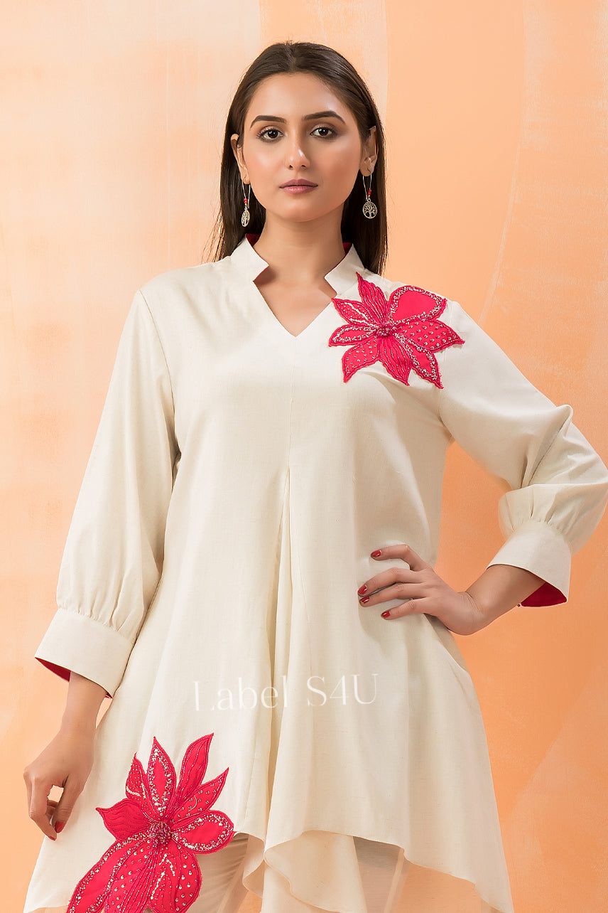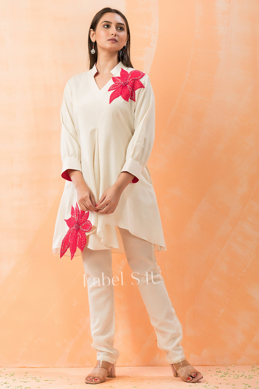 This Ivory Asymmetrical co-ord set is a statement of elegance with a touch of modern charm. Designed in a flowy, structured silhouette, the tunic features bold red floral appliqué details, adding a striking contrast to the soft ivory base. Paired with pants, this outfit balances grace with contemporary style, making it perfect for brunches, festive gatherings, or evening soirées.