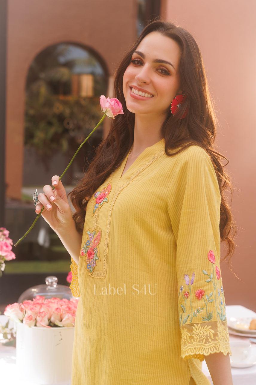 Step into summer with the Buttercup Whisper Suit Set, a soft yellow beauty with pastel floral embroidery that feels as fresh as a garden breeze. Featuring statement sleeves, tonal embroidery, and a breezy dupatta, this set is your go-to for light festivities, family lunches, or when you just want to glow effortlessly. Style it with minimal jewelry and let the florals do the talking.