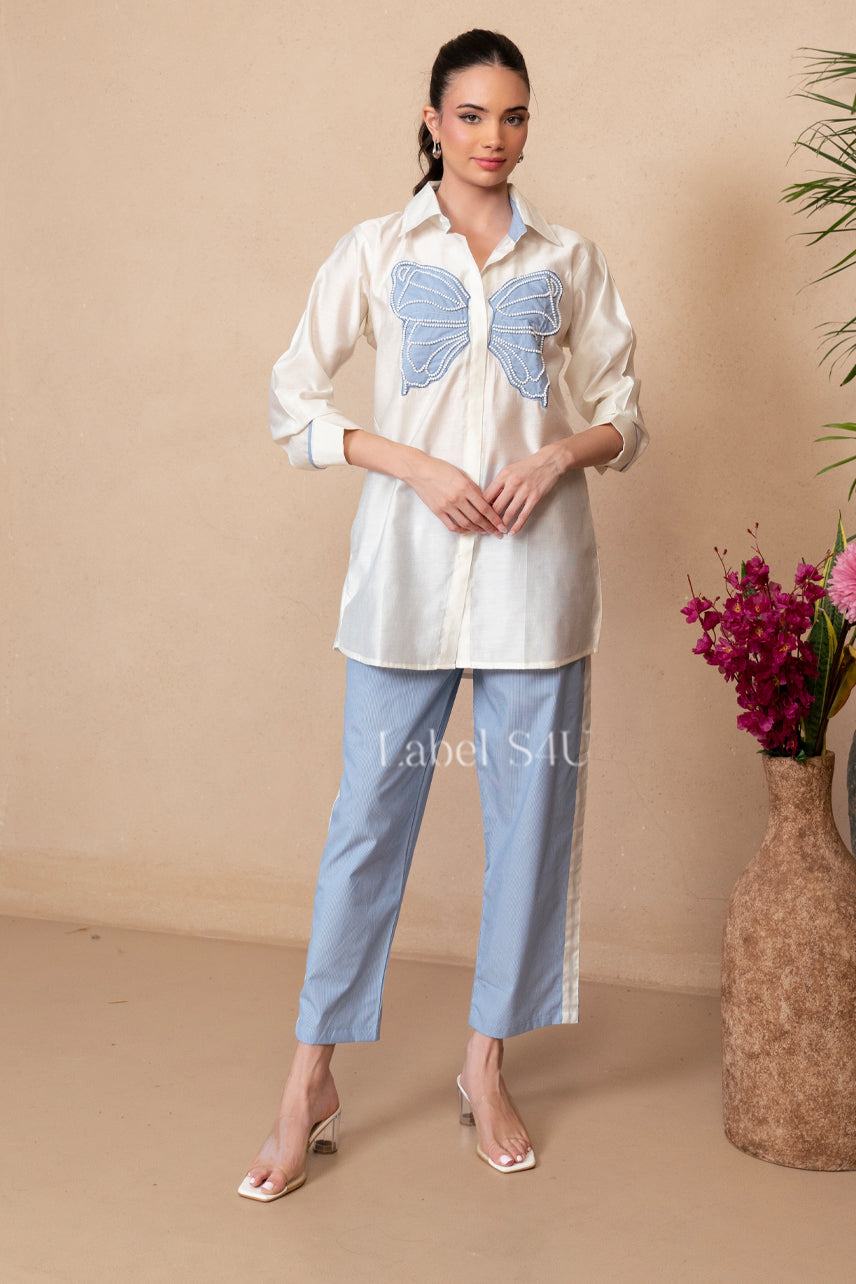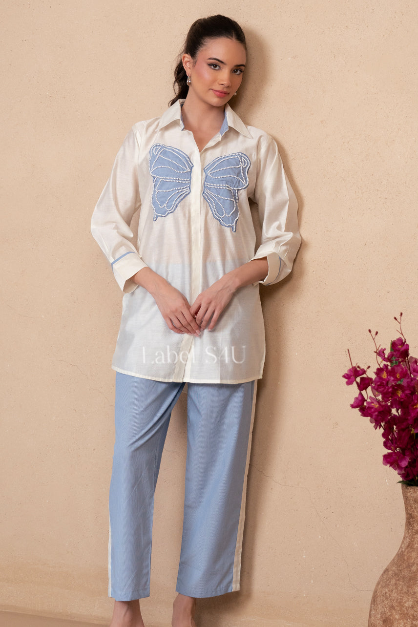 Float through your day in our Butterfly Kisses Co-Ord Set, where comfort meets charm. This ivory shirt features a soft blue butterfly embroidery, adding a playful yet elegant touch. Paired with pinstriped powder blue pants with side panels, it’s perfect for a relaxed brunch, work-from-home glam, or a breezy travel look.