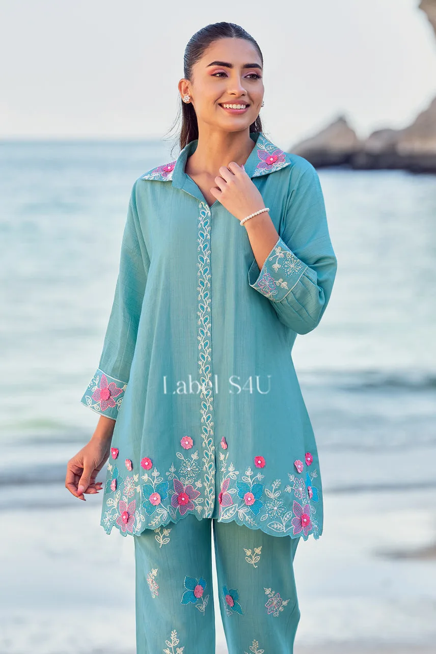 Dive into serene elegance with our Float in Freshness-Co-Ord Set! 🌊✨ This soothing aqua-hued set is adorned with delicate floral embroidery, creating a fresh and breezy look perfect for summer. The flowy silhouette, collared neckline, and intricate lace detailing add an effortless charm, making it ideal for vacations, brunch dates, or casual outings. Designed for comfort and style, this co-ord set is your go-to for a chic yet relaxed vibe. Pair it with statement earrings and sandals to complete the look!