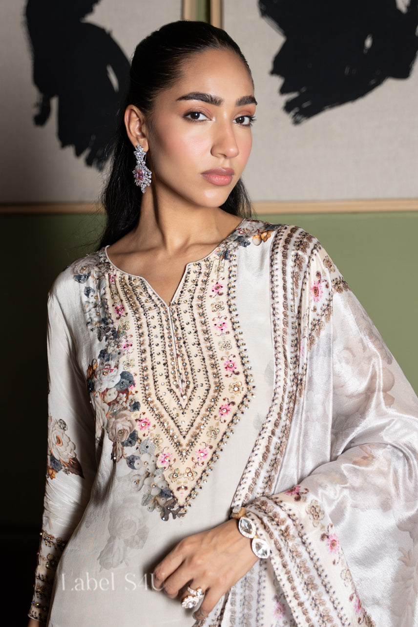 Gulnaar Grace-Sharara Set suits suitable for gifts for birthdays, anniversaries, or weddings, thanks to their beautiful elegant presentation and timeless unique style.