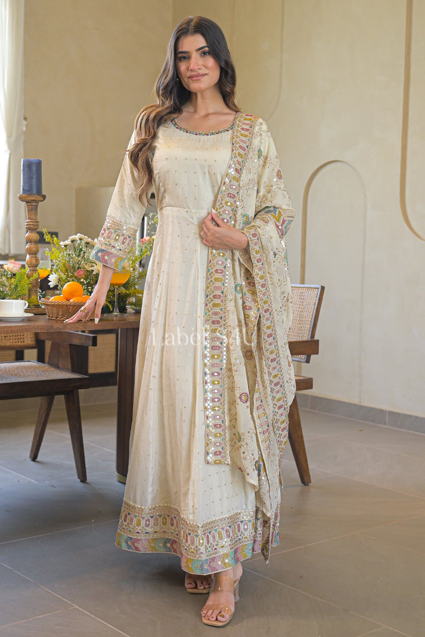 Noor-E-Ivory-Anarkali suits suitable for gifts for birthdays, anniversaries, or weddings, thanks to their beautiful elegant presentation and timeless unique style.