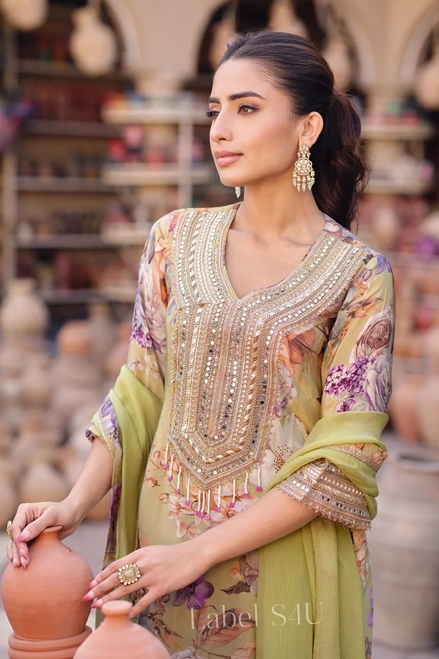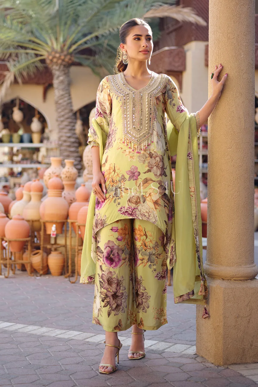 Elevate your style with our Paradise Green-Suit Set. This stunning Floral Elegance suit set with delicate beadwork and a vibrant floral print is perfect for weddings and special occasions. The kurta and flowy palazzo offer both comfort and luxury, making it a must-have for those seeking affordable designer wear. Shop now for an effortlessly elegant look.