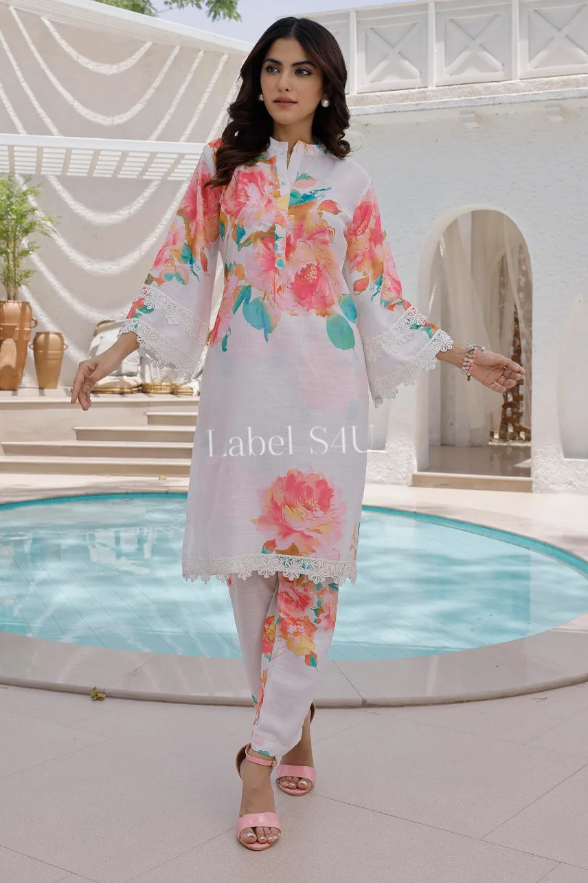 Fresh, feminine, and effortlessly chic, our Summer Petals Co-ord Set is the epitome of summer elegance. Designed in a soft white base and adorned with vibrant watercolor floral prints, this breezy silhouette is all about comfort meeting style. The lace-detailed sleeves and hemline add a delicate touch, while the straight-fit pants keep the look polished yet relaxed. Whether you’re heading to a brunch, a holiday getaway, or a casual day out, this set promises to keep you looking effortlessly stylish and on-trend. Pair it with minimal accessories and strappy heels for a picture-perfect ensemble!