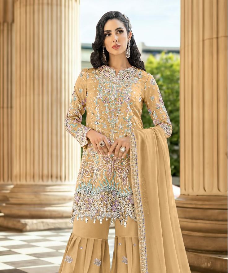 Styles option for the richly embroidered unstitched or semi-stitched suits paired with net or georgette dupattas. If you want for look royal, team them up with heels and statement jewellery.
