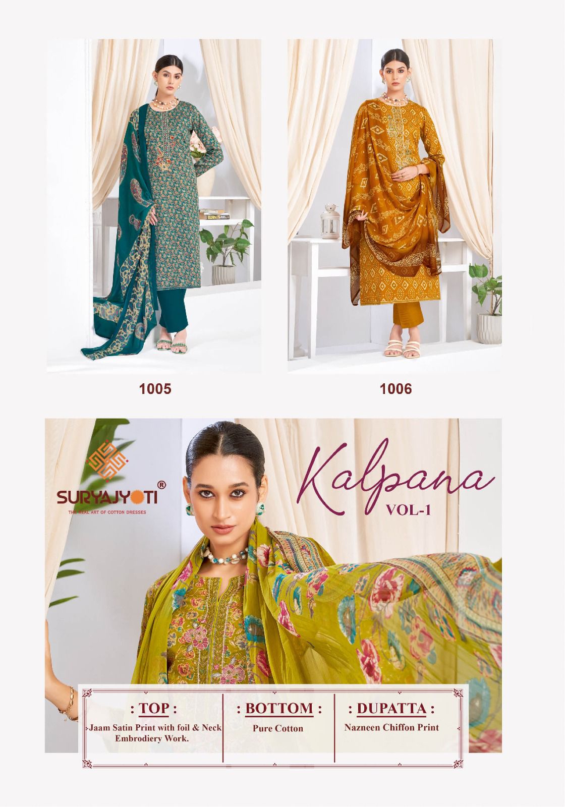 SURYAJYOTI KALPANA VOL 1 contains superior Fabrics, with perfect craftsmanship makes it one most best quality suits catalogue. Best commitment to ungearing quality.