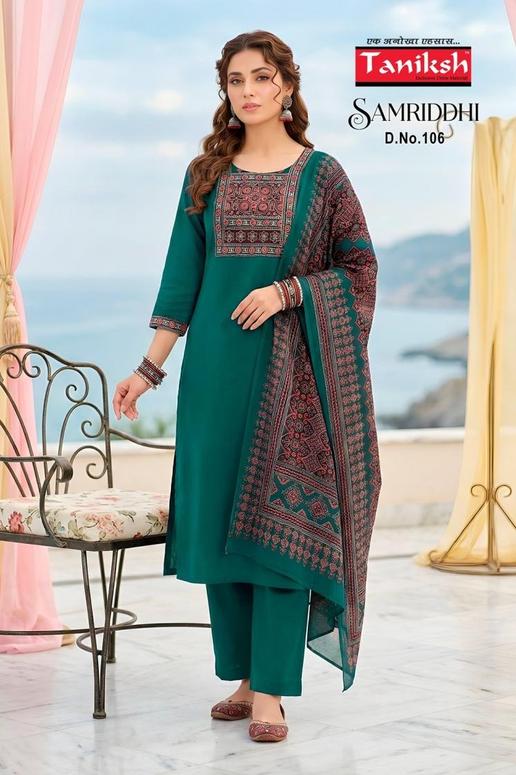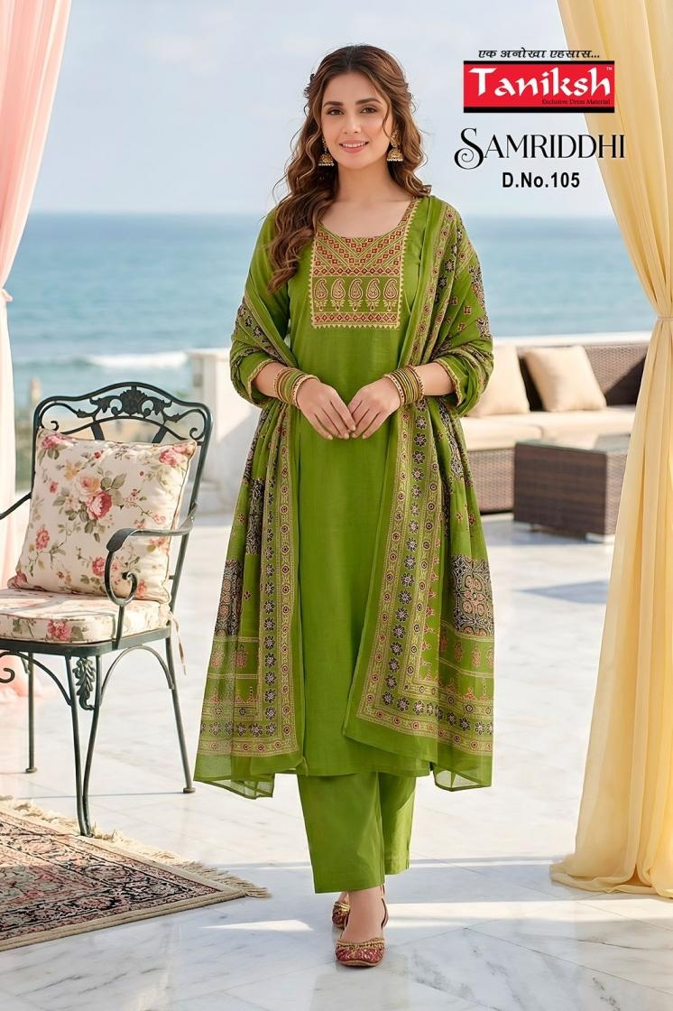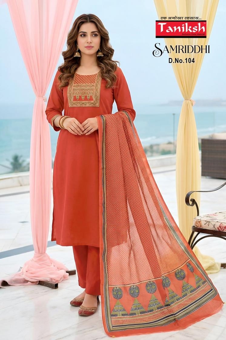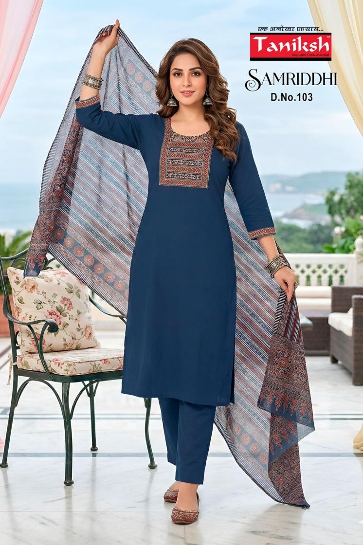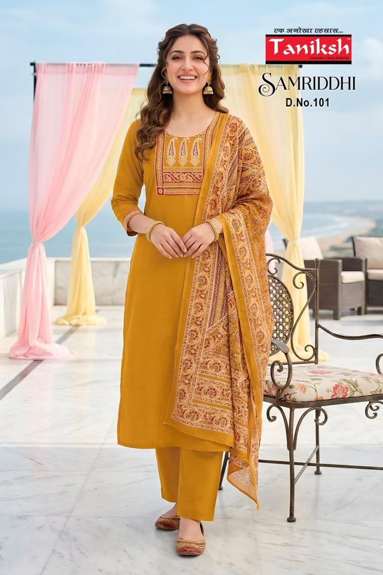 A Designer Collection that speaks about Volumes. taniksh samriddhi vol 1 series 101 to 108 dhabu cotton readymade suit in wholesale surat catalogue is more than just a clothing collection; it speaks the story of fashion, comfort, and culture.
