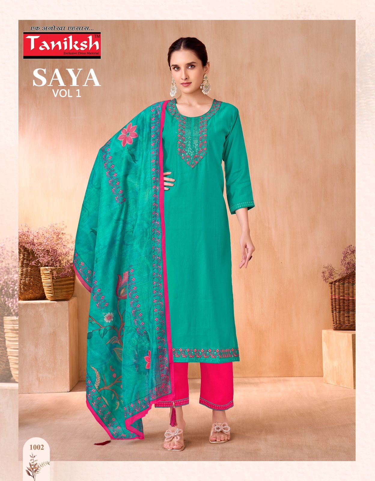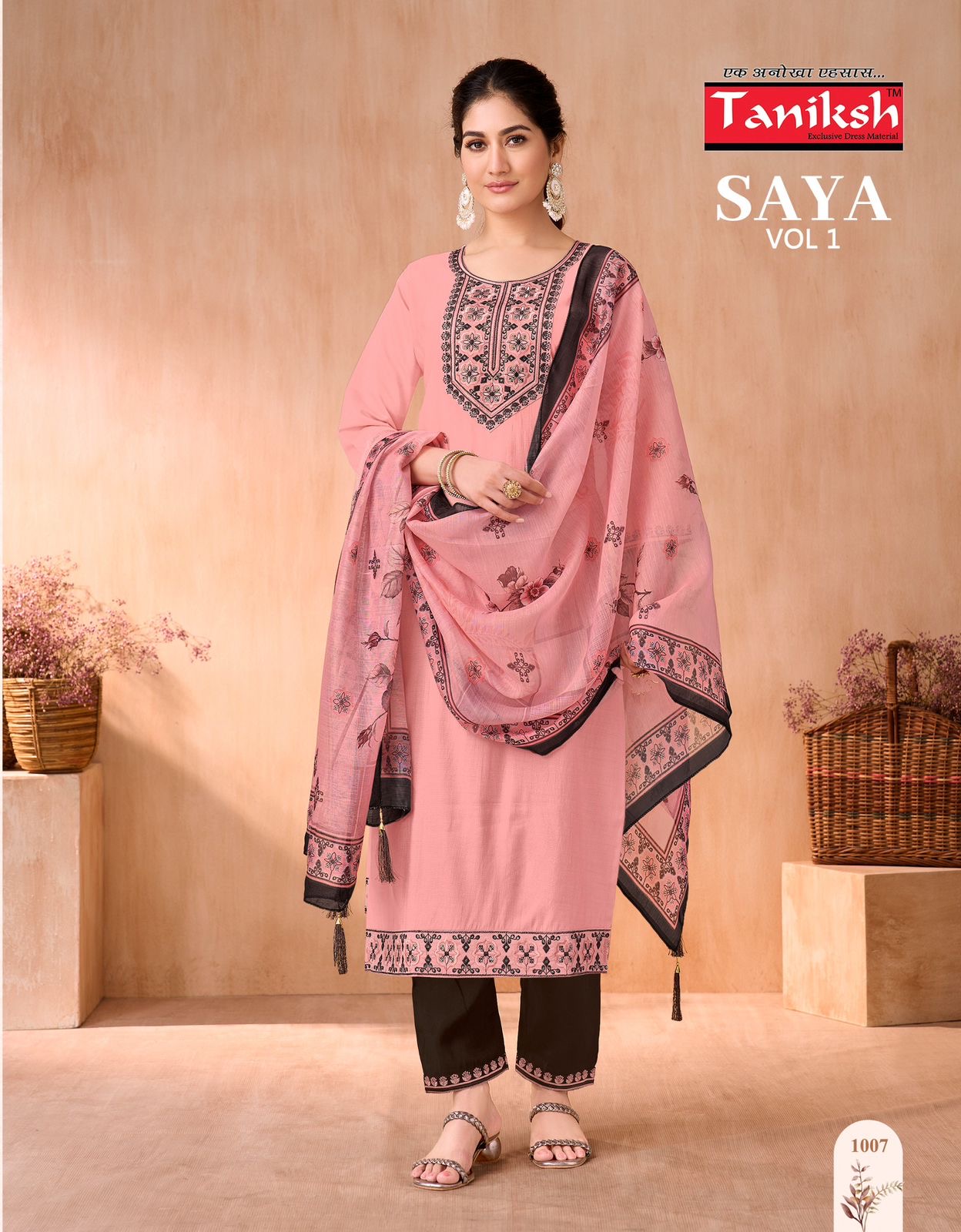 TANIKSH SAYA VOL 1 contains superior Fabrics, with perfect craftsmanship makes it one most best quality suits catalogue. Best commitment to ungearing quality.