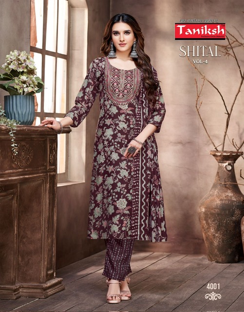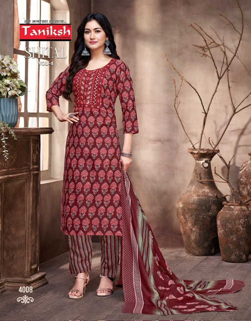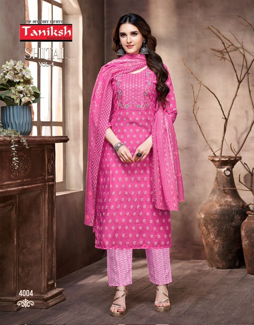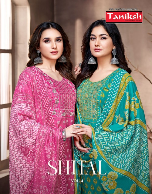 TANIKSH SHITAL VOL 4 contains superior Fabrics, with perfect craftsmanship makes it one most best quality suits catalogue. Best commitment to ungearing quality.