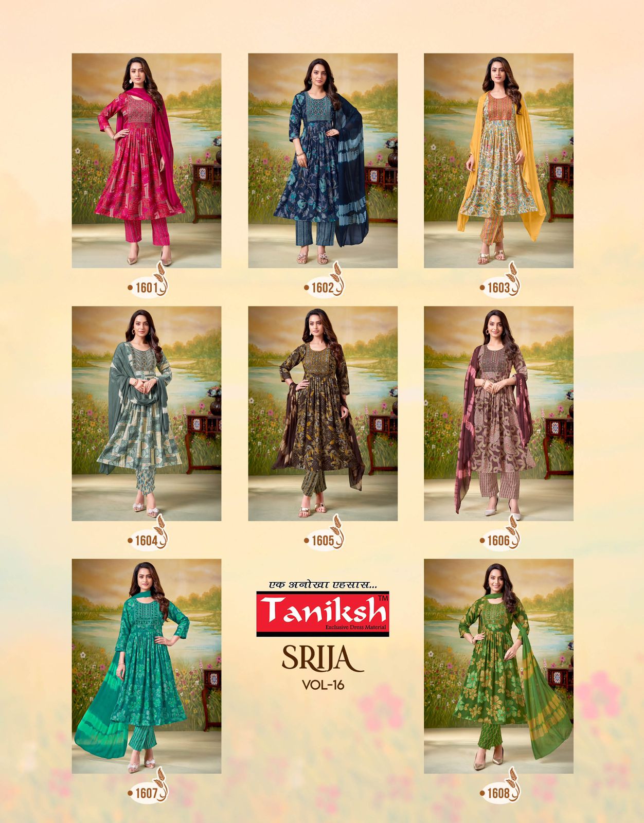 TANIKSH SRIJA VOL 16 contains superior Fabrics, with perfect craftsmanship makes it one most best quality suits catalogue. Best commitment to ungearing quality.