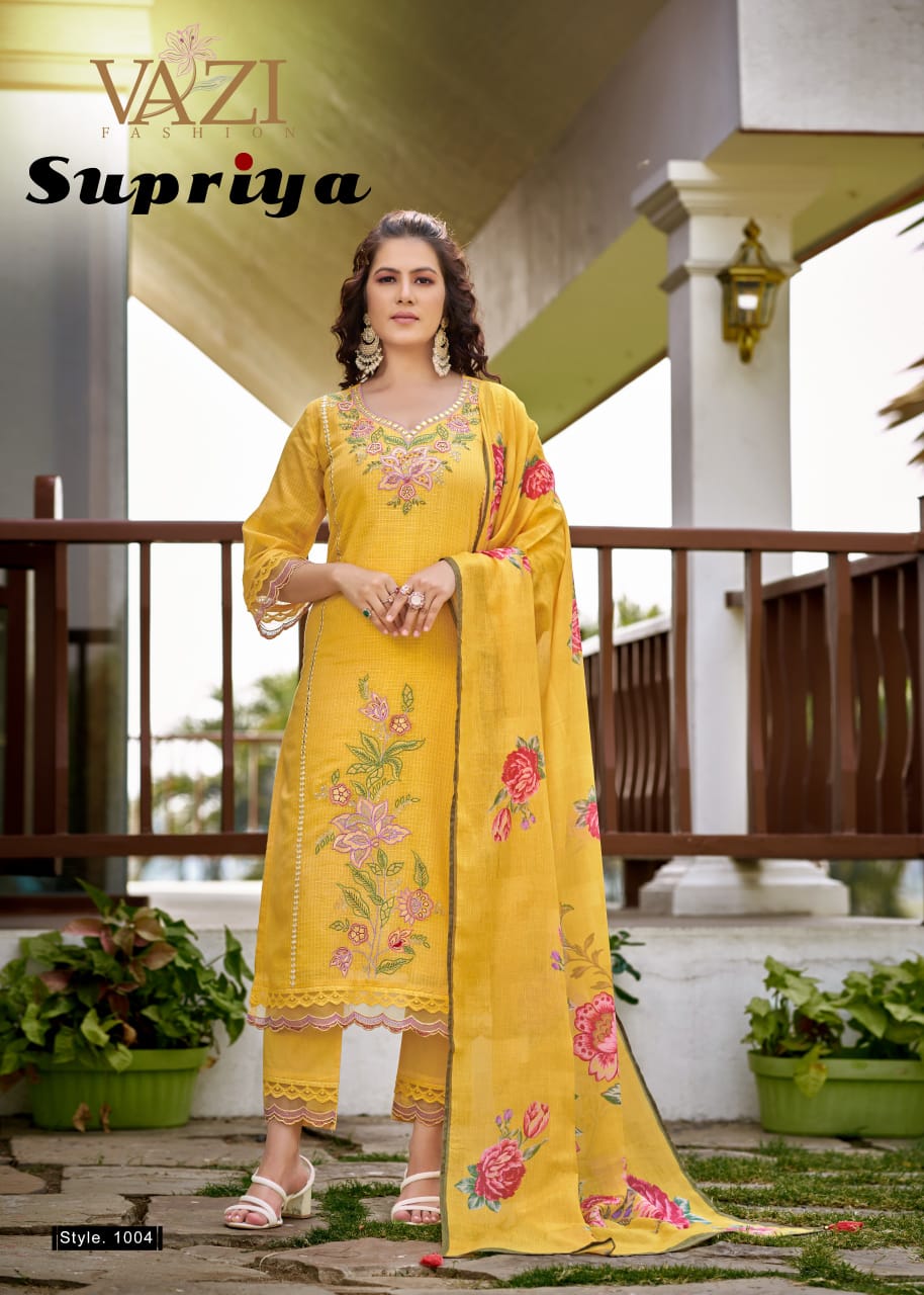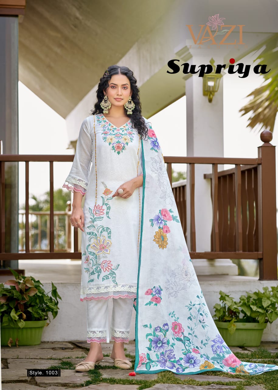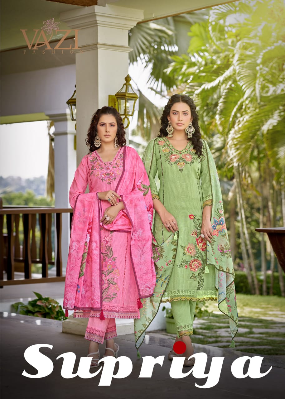 VAZI FASHION SUPRIYA contains superior Fabrics, with perfect craftsmanship makes it one most best quality suits catalogue. Best commitment to ungearing quality.