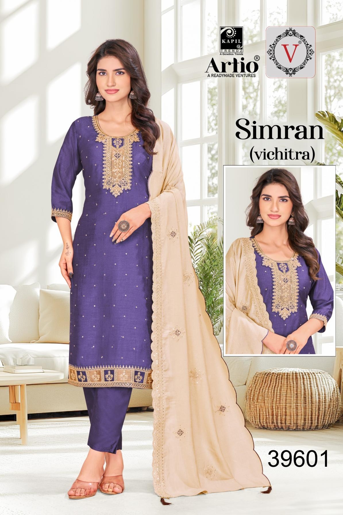 veda kapil trendz simran series 39601 to 39604 vichitra silk full stitch combo suits in wholesale surat suitable for both variety of styles and age groups. Can be made in different styles like Anarkali’s, sleek straight-cut suits, and classic salwar sets for every occasion. Whether you want it during your bride-to-be, a busy professional, or someone who loves ethnic wear, this designer suit makes you centre of extraction to everyone.