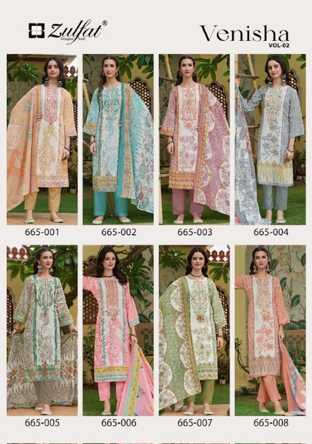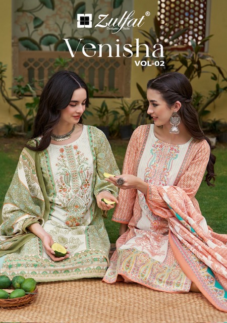 ZULFAT VENISHA VOL 2 contains superior Fabrics, with perfect craftsmanship makes it one most best quality suits catalogue. Best commitment to ungearing quality.