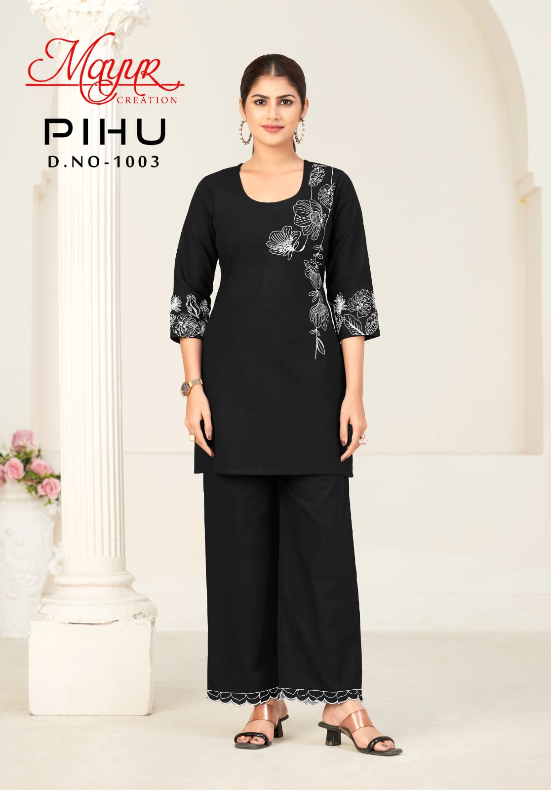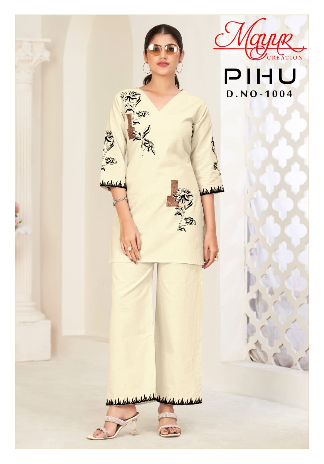 MAYUR CREATION PIHU contains superior Fabrics, with perfect craftsmanship makes it one most best quality suits catalogue. Best commitment to ungearing quality.