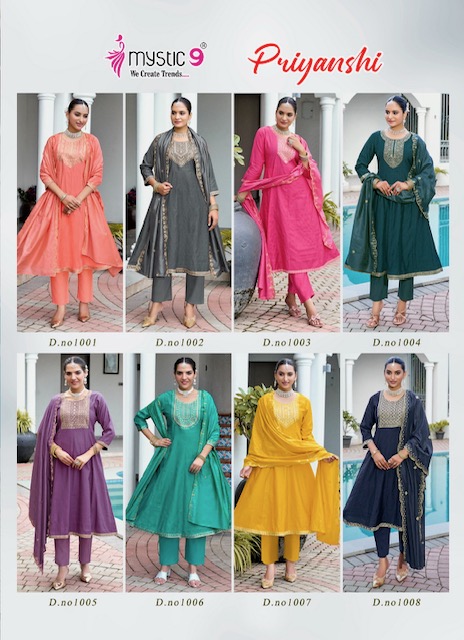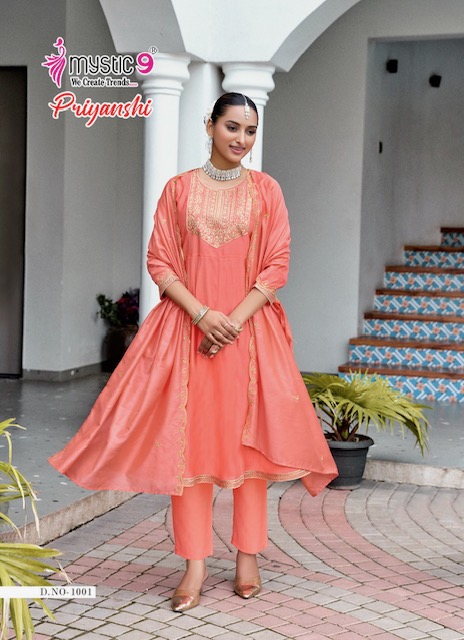 MYSTIC 9 PRIYANSHI VOL 1 contains superior Fabrics, with perfect craftsmanship makes it one most best quality suits catalogue. Best commitment to ungearing quality.
