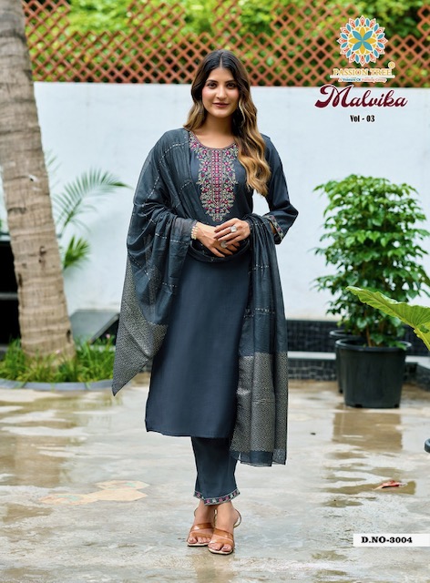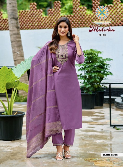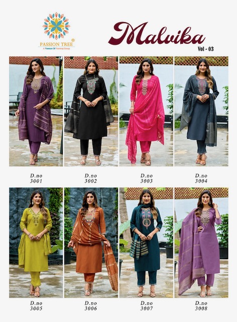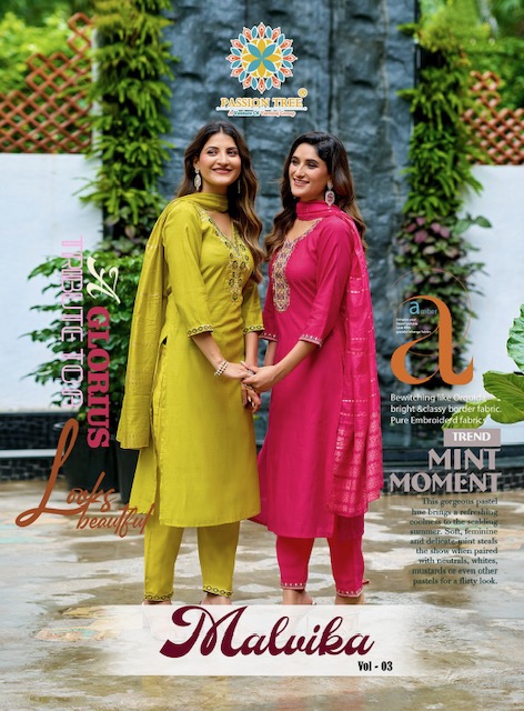 PASSION TREE MALVIKA VOL 3 contains superior Fabrics, with perfect craftsmanship makes it one most best quality suits catalogue. Best commitment to ungearing quality.