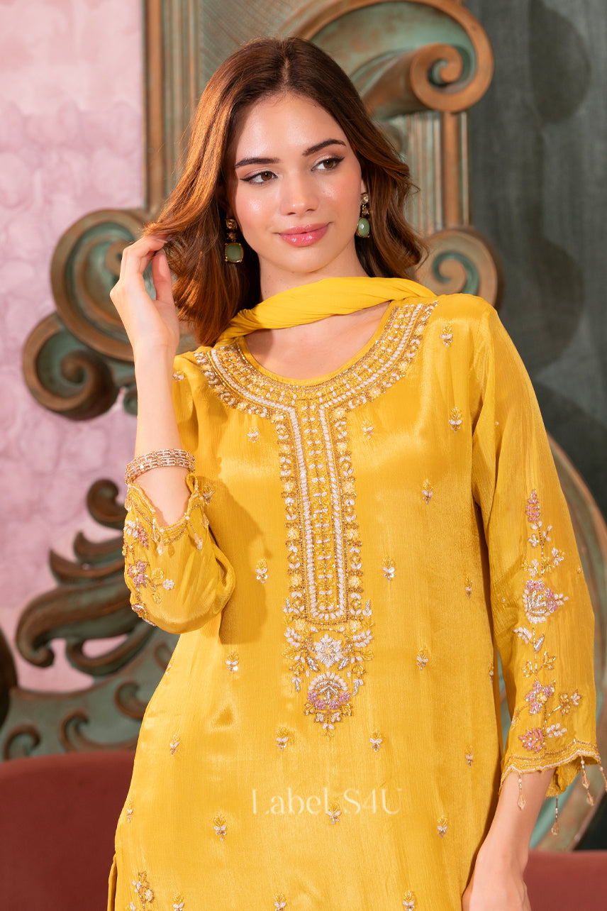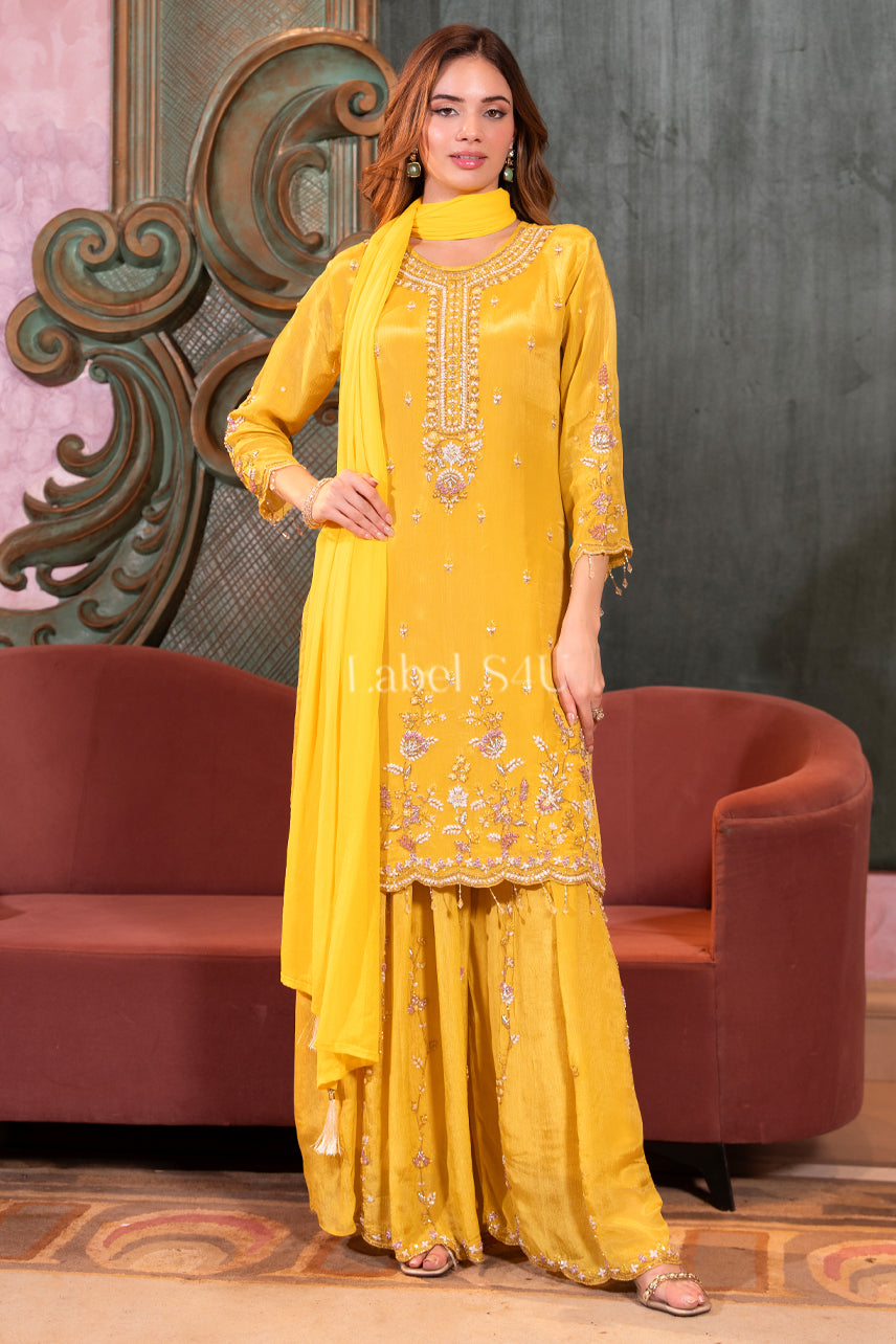 Mustard Yellow Spark-Sharara Set suits suitable for gifts for birthdays, anniversaries, or weddings, thanks to their beautiful elegant presentation and timeless unique style.