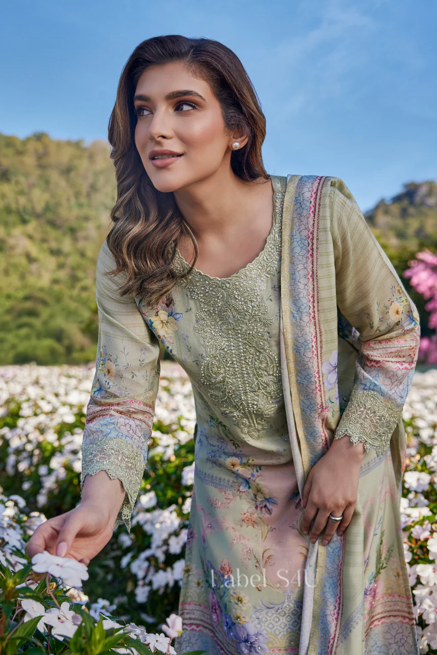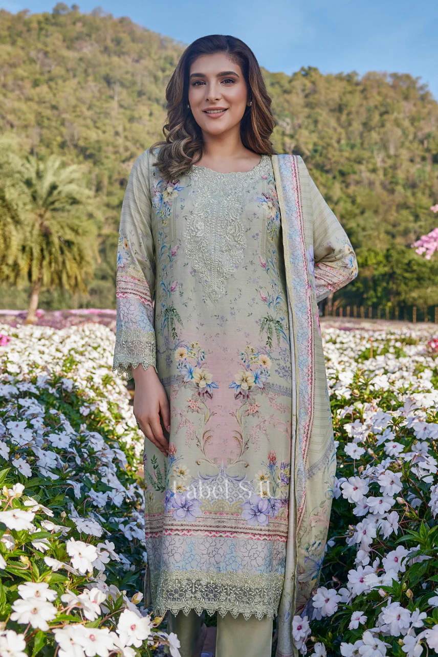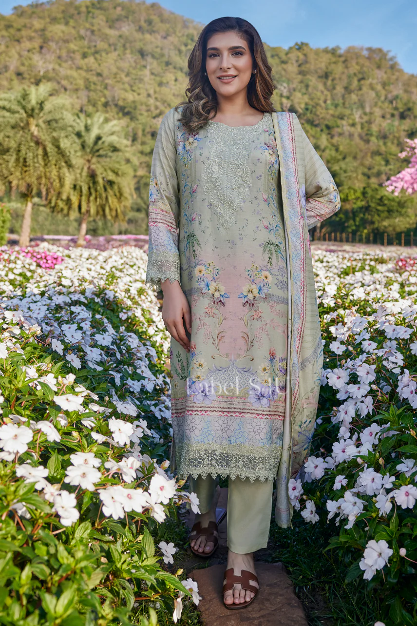 Sage Green Floral Printed-Suit Set contains superior Fabrics, with perfect craftsmanship makes it one most best quality suits catalogue. Best commitment to ungearing quality.