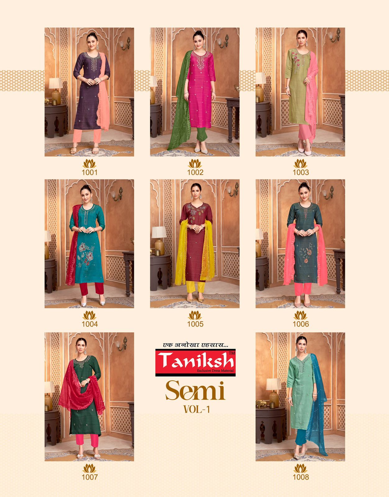 TANIKSH SEMI VOL 1 contains superior Fabrics, with perfect craftsmanship makes it one most best quality suits catalogue. Best commitment to ungearing quality.