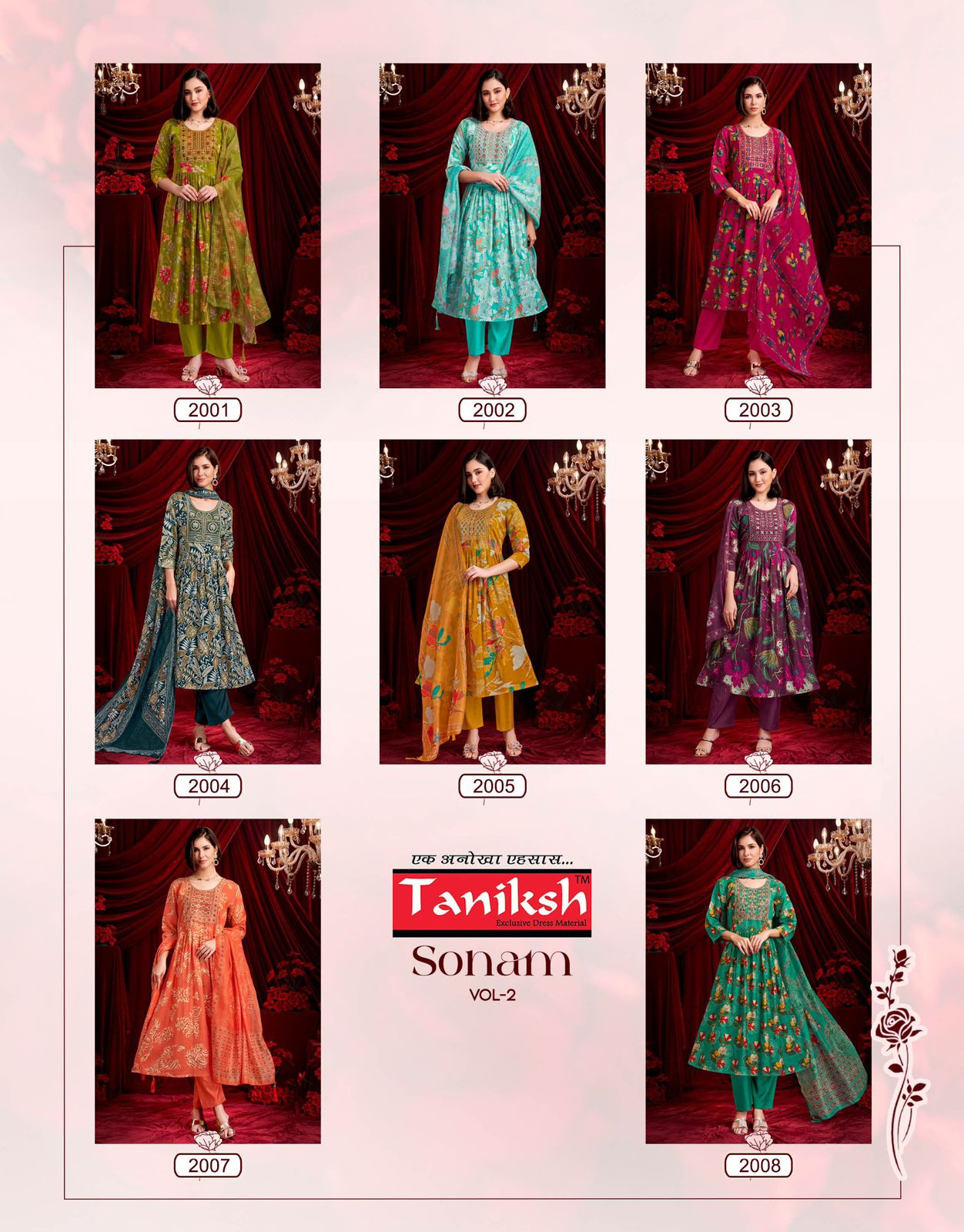 TANIKSH SONAM VOL 2 contains superior Fabrics, with perfect craftsmanship makes it one most best quality suits catalogue. Best commitment to ungearing quality.
