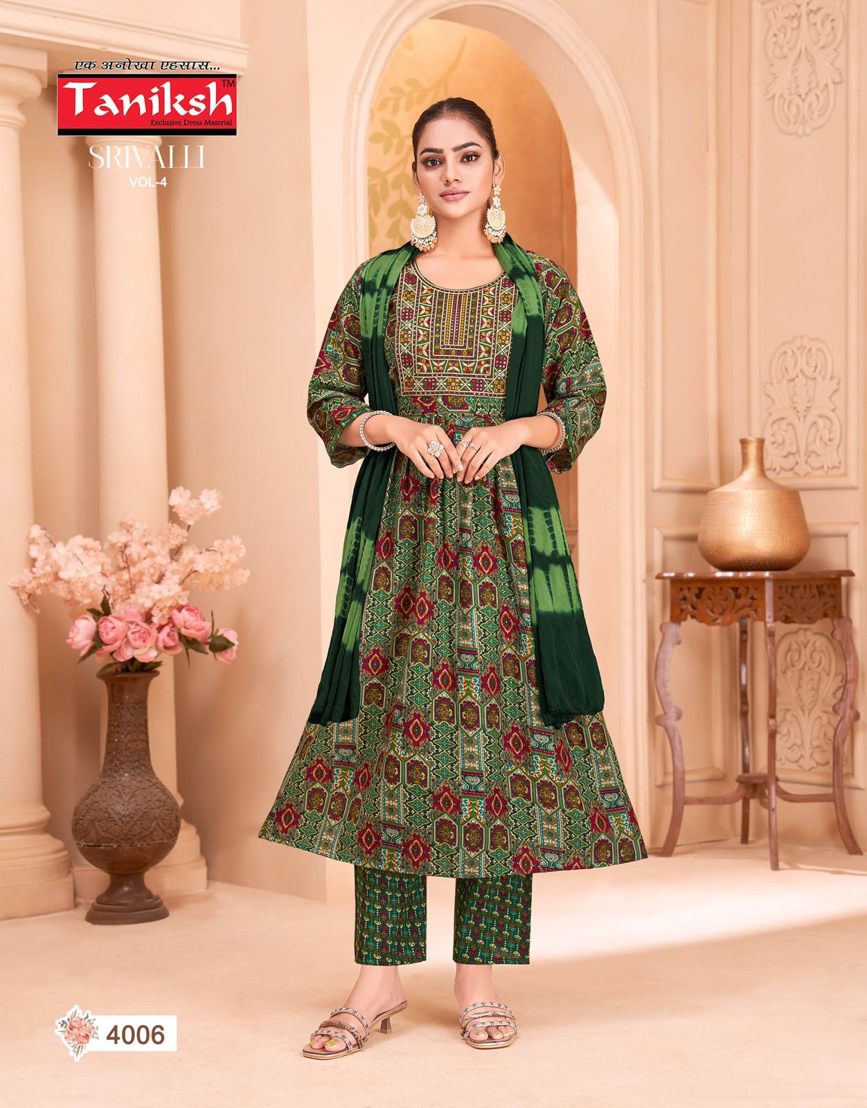 TANIKSH SRIVALLI VOL 4 contains superior Fabrics, with perfect craftsmanship makes it one most best quality suits catalogue. Best commitment to ungearing quality.