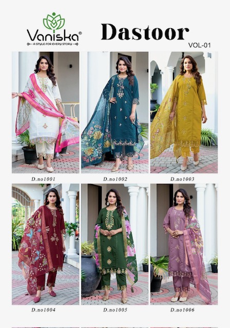 VANISKA DASTOOR VOL 1 contains superior Fabrics, with perfect craftsmanship makes it one most best quality suits catalogue. Best commitment to ungearing quality.